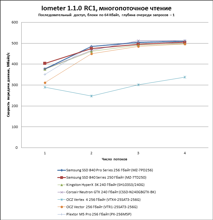 Снова тест на многопоточное чтение — и снова накопители Samsung лидируют, демонстрируя хорошую динамику производительности в ответ на прибавление потоков. Хотя Corsair Neutron GTX от них почти не отстаёт, а при трёх потоках немного обгоняет двух наших главных подопытных.