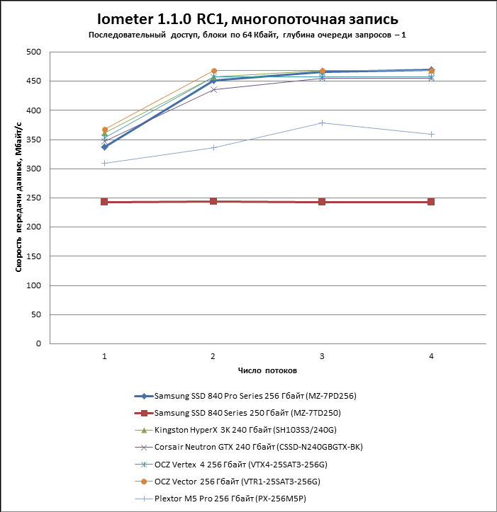 Уже становится традицией то, что в тестах, посвящённых записи, накопитель Samsung 840 Series показывает худшие результаты. Так получилось и сейчас — его скорость не увеличивается в зависимости от количества потоков.