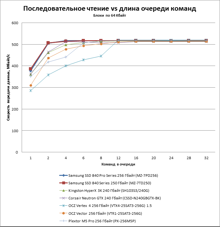Другое дело — Samsung 840 Pro: этот диск набирает максимальную скорость уже при четырёх командах в очереди. Это хороший результат, вполне соответствующий специфике нагрузки пользовательских SSD, но не лучший — Corsair Neutron GTX, как и OCZ Vector, набирает максимальную скорость записи уже при двух командах в очереди.