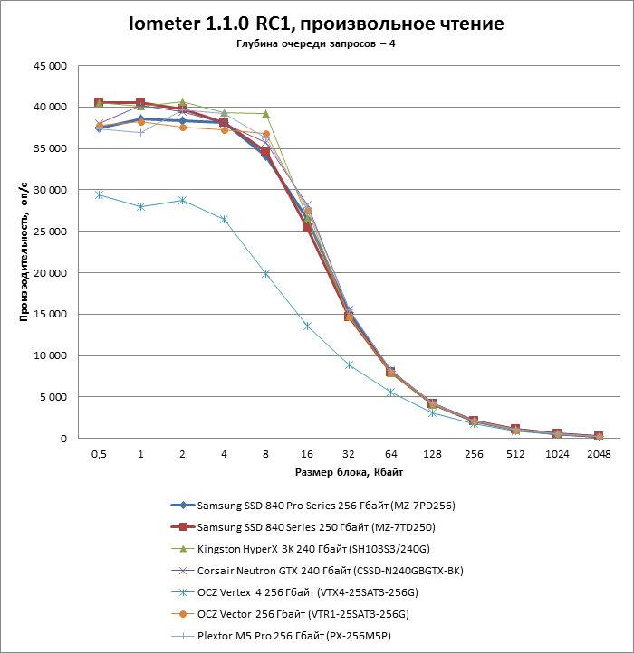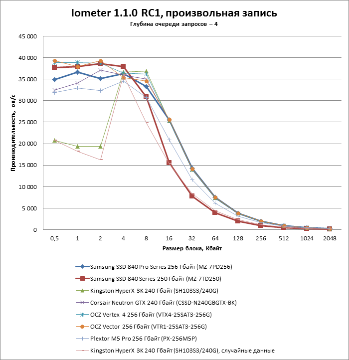 В этом тесте общепринятым критерием оценки является то, какую скорость покажет накопитель на блоках размером в 4 Кбайт. В нашем случае SSD Samsung 840 и 840 Pro удалось продемонстрировать отличные результаты, с небольшим преимуществом в пользу последнего. Впрочем, и результаты соперников под другими марками (за исключением Vertex 4) сходятся в этой точке графика с разницей в пределах 5 оп./с.