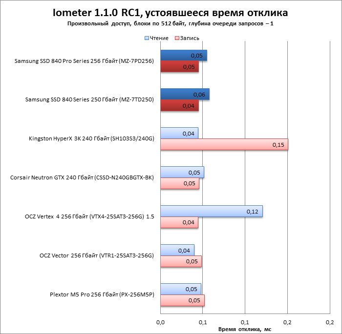 В этом тесте двое наших главных подопытных показали практически одинаковые результаты. Собственно, почти то же самое можно сказать и про других участников тестирования, если, конечно, не обращать внимания на неприлично высокое время отклика у Kingston HyperX 3K при записи и у OCZ Vertex 4 при чтении.