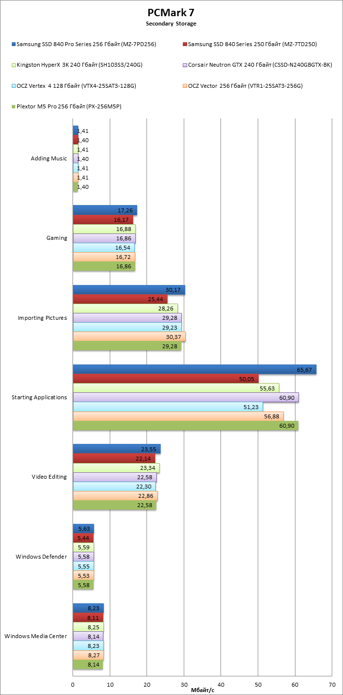 На следующей диаграмме видно, в каких именно субтестах хорошо ввыступил накопитель Samsung 840 Pro. Это были тесты на импорт изображений, запуск приложений и редактирование видео.