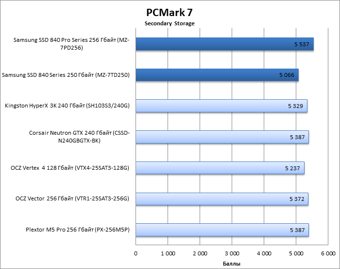 В финском бенчмарке PCMark 7 накопитель Samsung 840 Pro показал хорошие, но не лучшие результаты — снова его совсем чуть-чуть опередил диск Corsair Neutron GTX.