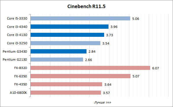 Финальный рендеринг — не самая подходящая задача для решения в системах с двухъядерными процессорами. Не спасает положение и присутствующая в представителях семейства Core i3 технология Hyper-Threading. Младший четырёхъядерник для платформы LGA1155, хоть он и обладает устаревшей микроархитектурой, серьёзно превосходит старшие процессоры из нового поколения Core i3. Тем не менее микроархитектура Haswell делает Core i3-4340 и Core i3-4130 быстрее предшественников настолько, что им удаётся обойти конкурирующий четырёхъядерный AMD FX-4350. Процессоры же линейки Pentium в этом тесте ожидаемо находятся на аутсайдерских позициях, и прирост быстродействия, привнесённый в их более свежую модификацию, ничего не решает.