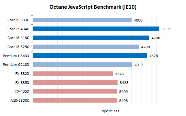 Современные интернет-браузеры относятся к числу однопоточных приложений. Поэтому тут процессоры Core i3-4340, Core i3-4130 и Pentium G3430 находятся на высоте. Им удаётся блеснуть своей высочайшей однопоточной производительностью, которая как раз и достигается за счёт новой микроархитектуры Haswell, предложившей более высокий темп исполнения обычных арифметико-логических операций.