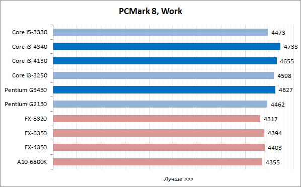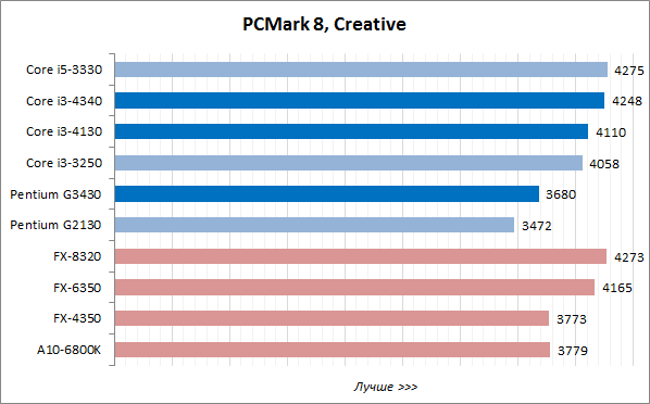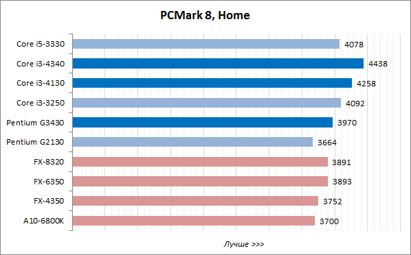 В бенчмарке PCMark 8, который моделирует среднестатистическую пользовательскую нагрузку при различных сценариях использования персонального компьютера, двухъядерные процессоры поколения Haswell показывают себя сравнительно неплохо. Платформа LGA1150, оснащённая Core i3-4340 или Core i3-4130, работает заметно быстрее, нежели конфигурация на процессорах аналогичного класса, относящихся к прошлому поколению. То же самое можно сказать и в адрес Pentium. Новая микроархитектура Haswell по сравнению с Ivy Bridge позволяет получить преимущество, достигающее восьми процентов.