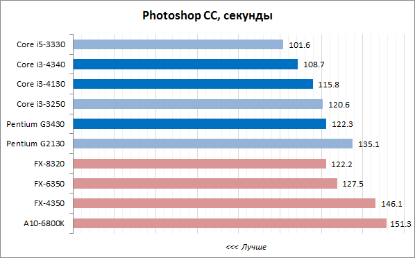Заметно быстрее своих предшественников работают двухъядерники поколения Haswell и в последней версии Photoshop. Здесь им, конечно, не удаётся дотянуться до показателей Core i5 предыдущего поколения, зато процессоры конкурента с аналогичной ценой оказываются повержены, в том числе и восьмиядерный FX-8320. Разница же в быстродействии старших Core i3 для разных платформ достигает 10 процентов.