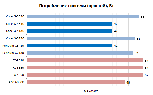 Следует заметить, что значительный рост потребления у процессоров с дизайном Haswell происходит именно при максимальной нагрузке, особенно такой, которая задействует процессорные векторные инструкции. Если же сравнивать энергопотребление систем в обычных условиях, не созданных искусственным путём, то всё встаёт на свои места. Системы, построенные на Core i3-4340 или Core i3-4130, в игре расходуют электроэнергии меньше чем аналогичная платформа на базе Core i3-3250. Так же дело обстоит и с процессорами семейства Pentium, относящимися к новому и старому поколениям.