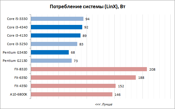 Максимальная нагрузка на вычислительные ресурсы, создаваемая утилитой Linx 0.6.4 AVX, приводит к выявлению катастрофически высокого потребления процессоров AMD. Современные решения Intel, обладающие в целом сравнимой производительностью, расходуют энергию примерно вдвое оптимальней. Впрочем, несмотря на теоретическое снижение энергетических аппетитов процессоров Core i3 с дизайном Haswell, на практике мы видим противоположную картину. Двухъядерные новинки потребляют при максимальной нагрузке на несколько ватт больше своих предшественников. Однако это не относится к процессорам Pentium. С ними ситуация обратная: именно такая, как и заложена в официальных спецификациях.