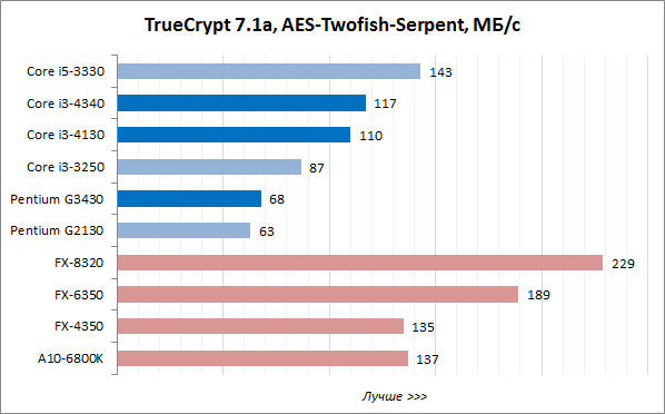 Благодаря тому, что с переходом на микроархитектуру Haswell в Core i3 наконец появилась поддержка AES, разница в скорости старых и новых двухъядерных процессоров этого семейства весьма впечатляет. Впрочем, для высокой скорости обработки данных в TrueCrypt желательно наличие в процессоре и более чем двух ядер, так что относительные показатели Core i3-4340 и Core i3-4130 и уж тем более лишённого поддержки Hyper-Threading Pentium G3430 на фоне конкурирующих процессоров с большим числом ядер выглядят достаточно слабо.