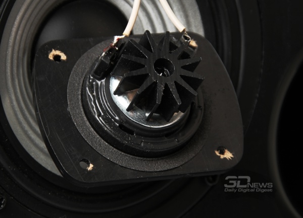 Отдельно хотелось бы подчеркнуть, что для более надёжного крепления СЧ- и ВЧ-головок в МДФ-плите передней панели корпуса отфрезерованы специальные фаски. Динамики располагаются заподлицо с поверхностью фронтальной панели, лежат в своих «кроватках» как влитые даже без крепежа (и уж тем более клея) и с огромным трудом поддаются изъятию. Поэтому ради сохранения целостности конструкции крайне не рекомендуем повторять за нами процесс разборки системы без крайней нужды. Кстати, для крепления каждого из динамиков используются саморезы различного типоразмера. Казалось бы — мелочь, но такое внимание к второстепенным деталям не может не подкупать.