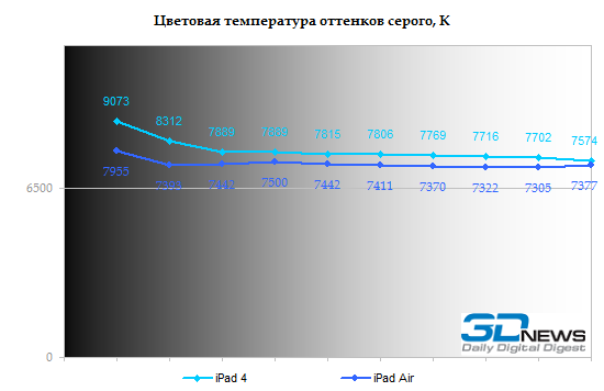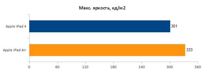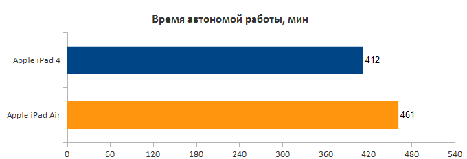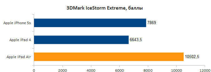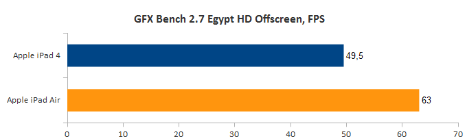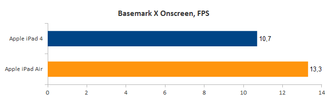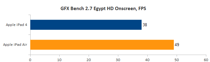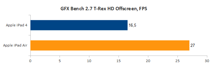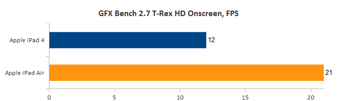 Также, как удалось обнаружить нашим коллегам из Anandtech.com, процессор в iPad Air способен дольше работать на максимальной частоте, чем чип в iPhone 5s – иными словами, он реже и менее охотно сваливается в «троттлинг». Очевидно, дело в более крупном корпусе — и, соответственно, в более интенсивном охлаждении. Процессор в iPhone 5s может выжимать из себя максимум в течение 2 минут, после чего его производительность скачкообразно снижается почти в полтора раза, в то время как мощность iPad Air почти не уменьшается со временем. Графика PowerVR SGX G6430, относящаяся к новому семейству Rogue, работает, судя по всему, на частоте 450 МГц — как и в iPhone 5s. Производительность на такт у нее такая же, как у SGX 554MP4, установленной в iPad 4, но частота, похоже, выше — и чуть ли не в два раза. В результате и производительность в большинстве графических задач у iPad Air будет выше, чем у его предшественника. Хотя тут нельзя предсказывать со 100%-й уверенностью — все-таки архитектуры у видеоадаптеров принципиально разные, старая может лучше подходить для одного типа задач, новая — для другого.