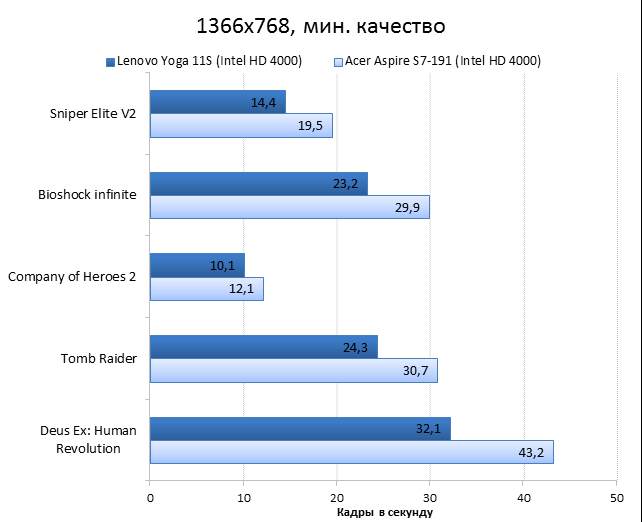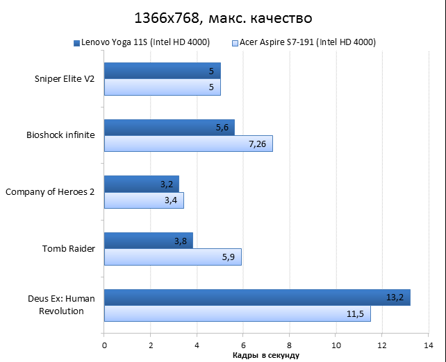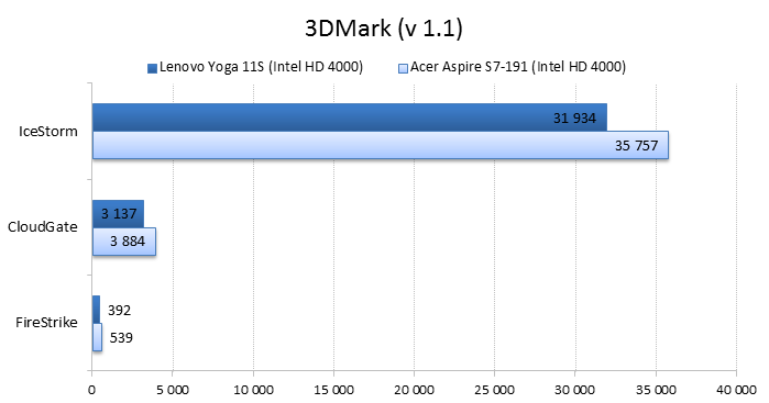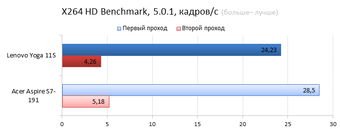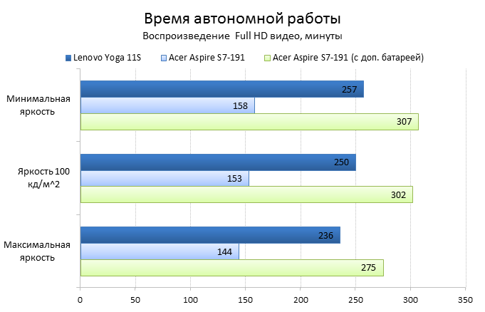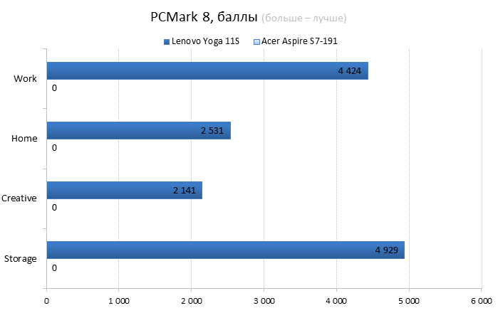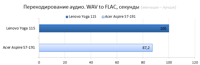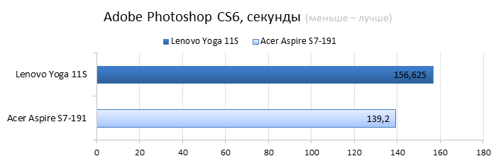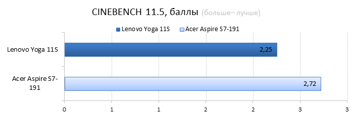 Разумеется, в новую «Йогу» установлен другой процессор: это Intel Core i7-3689Y — самый «холодный» и дорогой чип из семейства Ivy Bridge. Его TDP составляет всего 13 Вт, что на 4 Вт меньше теплопакета большинства низковольтных процессоров Intel Ivy Bridge. Также в магазинах можно встретить конфигурации 11-дюймовой «Йоги» с процессорами Intel Core i3-4020Y, i3-3229Y, i5-4210Y и i5-3339Y. Иногда в продаже попадаются даже версии с процессорами Intel Pentium 2129Y — такие модификации стоят гораздо меньше остальных. ![]() ![]() В нашем экземпляре Lenovo Yoga 11s было установлено 8 Гбайт оперативной памяти, чего более чем достаточно для такого компактного лэптопа. При желании планку оперативной памяти можно заменить — правда, для этого придется повозиться с демонтажем клавиатуры ноутбука, в данном случае делается это не так уж просто. ![]() ![]() Разумеется, никакого дискретного видео в таком маленьком ноутбуке быть не может. Поэтому за все графические возможности Lenovo IdeaPad Yoga 11s отвечает встроенная в процессор графика Intel HD 4000. Для 11,6 дюйма и разрешения 1366х768 её вполне хватит. ![]() Внутри Lenovo IdeaPad Yoga 11s установлен всего один твердотельный накопитель. В 13-дюймовую «Йогу» влезал еще второй SSD — формфактора mSATA, но внутрь героя нашего обзора он просто не поместится. В нашей модификации был установлен SSD объёмом 256 Гбайт, кроме того, в продаже можно найти 11-дюймовые «Йоги» с накопителями объёмом в 128 или 512 Гбайт. Конечная цена Lenovo IdeaPad Yoga 11s, как и всегда, зависит от модификации. За ту версию «Йоги», которая попала в нашу тестовую лабораторию, придётся выложить примерно 44 тысячи рублей. Самая доступная Yoga 11s стоит гораздо дешевле — около 26 тысяч рублей. ⇡#Внутреннее устройство Lenovo IdeaPad Yoga 11sЧтобы заменить в Yoga 11s оперативную память, надо выполнить несколько не вполне тривиальных действий. Для начала придётся открутить два винта, которые прячутся под резиновыми ножками на обратной стороне ноутбука, затем необходимо потянуть на себя верхний край клавиатуры — только очень аккуратно, чтобы не порвать короткий шлейф. Так выглядит начало разборки ноутбука в инструкции Результат на практике Если же выкрутить из ноутбука остальные винты и отсоединить шлейфы, то можно будет снять упор для рук и увидеть материнскую плату и аккумулятор Lenovo IdeaPad Yoga 11s. Отличия от 13-дюймовой «Йоги» заметны сразу. Так, в Yoga 11s установлена всего одна турбина вместо двух, да и посадочной площадки под ещё один твердотельный накопитель здесь нет — второй разъём mSATA банально не влез в такой компактный ноутбук. Lenovo IdeaPad Yoga 11s с аккумулятором Lenovo IdeaPad Yoga 11s без аккумулятора А вот батарея у Lenovo IdeaPad Yoga 11s получилась очень внушительной для такого маленького ноутбука. Аккумулятор состоит из четырех элементов питания и имеет ёмкость 42 Вт*ч (2840 мА*ч, 14,8 В). Аккумулятор Lenovo IdeaPad Yoga 11s ⇡#Тестирование Lenovo IdeaPad Yoga 11sНапомним, что с недавних пор мы тестируем ноутбуки по новой методике. Для сравнения результатов тестов в данном случае мы используем ультрабук Acer Aspire S7-119 — это модель с той же диагональю дисплея — 11,6 дюйма — и похожей начинкой. ⇡#Тестирование процессораПрежде чем перейти к тестам, напомним, какие процессоры установлены в сравниваемых нами ноутбуках. В Lenovo IdeaPad Yoga 11s использован Core i7-3689Y с тактовой частотой 1,5 ГГц (2,6 ГГц в режиме Turbo Boost). В Acer Aspire S7 установлен похожий процессор — Intel Core i7-3517U с тактовой частотой 1,9 ГГц (3,0 ГГц в режиме TurboBoost), объем кеша L3 у обоих ноу