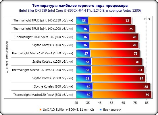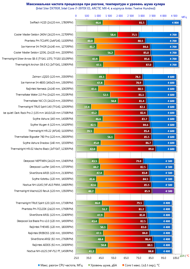 Внесём полученные результаты в сводную таблицу* и на диаграмму, где все протестированные нами системы охлаждения представлены в их штатных комплектациях при разгоне процессора до 4,4 ГГц и напряжении 1,245~1,250 В.