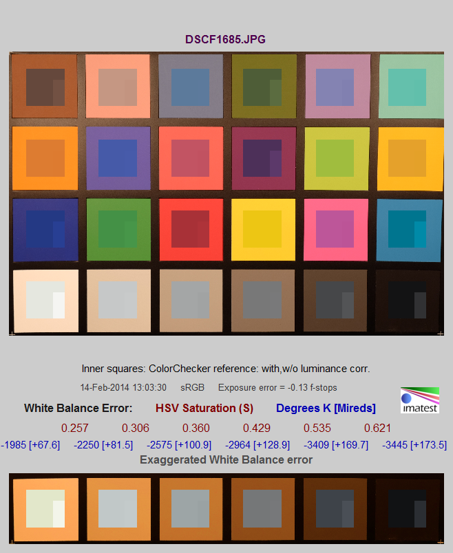 На изображениях в каждом поле малый внутренний прямоугольник является эталонным цветом, а внутренний квадрат — полученным камерой, но приведённым по яркости и контрасту, внешний квадрат — необработанная область, полученная с камеры. Красные числа обозначают отклонения цвета по шкале S в цветовом пространстве HSV, а синие — в градусах Кельвина [Майредах].