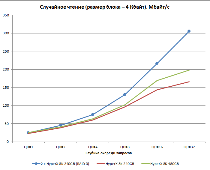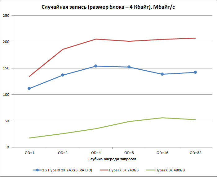 Приведённые графики служат ещё одной иллюстрацией к сказанному выше. Если при чтении RAID 0 демонстрирует более высокую скорость, чем одиночные твердотельные накопители, причём преимущество с ростом глубины очереди возрастает, то при операциях записи RAID 0 из Kingston HyperX 3K 240 Гбайт опережает лишь Kingston HyperX 3K 480 Гбайт. Один же Kingston HyperX 3K 240 Гбайт оказывается лучше массива.