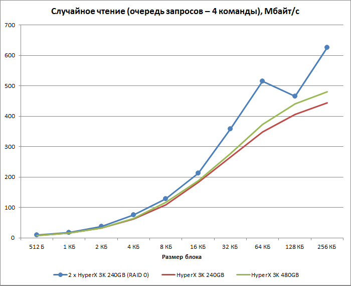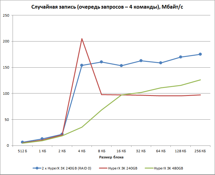 На самом деле, как оказывается, RAID 0-массив проигрывает по скорости записи одиночным накопителям, в него входящим, лишь в том случае, когда операции происходят 4-килобайтными блоками. Это и не удивительно. Как следует из графика, Kingston HyperX 3K 240 Гбайт оптимизирован под запросы размером 4 Кбайт, но RAID-контроллер в соответствии с выбранным нами размером страйп-блока преобразует их в 16-килобайтные запросы. К сожалению, использовать в массиве чередование 4-Кбайт блоков — далеко не самая выигрышная стратегия. В этом случае серьёзно возрастает создаваемая RAID-контроллером нагрузка на центральный процессор, и никакого реального прироста в скорости может и не оказаться.