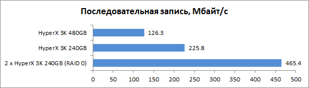 Последовательные дисковые операции — это именно та среда, где лучше всего видно масштабируемость производительности RAID-массивов. Массив с чередованием оказывается значительно быстрее одиночных Kingston HyperX 3K объёмом 240 и 480 Гбайт как при последовательном чтении, так и при записи.