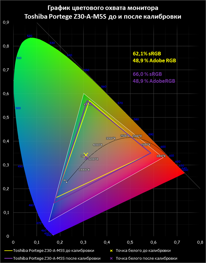 Как видно из таблицы, различия есть между всеми тремя лэптопами. Так, в ноутбуки Toshiba и Lenovo установлены одинаковые процессоры (Intel i5-4200U) и, как следствие, идентичные графические ядра. Хотя размеры дисплеев и объёмы оперативной памяти у них разные. Различий между Toshiba и «макбуком» будет немного больше. У этих ноутбуков разные процессоры, да и графическая составляющая у MacBook Air будет явно лучше — Intel HD 5000 вместо HD 4400. Зато у трёх этих ноутбуков есть одна общая черта: ни в одном из наших подопытных нет классического жёсткого диска — в качестве накопителя используются SSD. ⇡#Тестирование процессораИсходя из того, что максимальные частоты у всех трёх процессоров одинаковые, большого разброса в «процессорных» тестах ждать не стоит. Скорее всего, в них большую роль сыграют количество оперативной памяти и скорость твердотельного накопителя. ![]() ![]() ![]() Практика подтверждает нашу теорию. Разница между тремя нашими подопытными оказалась настолько малой, что ей можно пренебречь. ![]() А вот в PCMark 8 разница заметна сильнее. В этом тесте наш главный подопытный, Toshiba Portege Z30-A-M5S, оказался немного быстрее своих конкурентов. ⇡#Тестирование графикиКак мы уже писали выше, у всех трёх ноутбуков есть только встроенное видеоядро, при этом у Toshiba Portege Z30-A-M5S и Lenovo ThinkPad X240 оно одинаковое — это Intel HD 4400. В этой версии графического ядра задействовано 20 исполнительных модулей, а максимальная частота видеоядра составляет 1,1 ГГц. Внутри «макбука» установлен видеоадаптер пошустрее, Intel HD 5000: частота та же, но исполнительных модулей вдвое больше — 40 штук. Правда, прежде чем переходить к тестам, стоит пояснить, что реальная «максималка» графического ядра будет зависеть от настроек BIOS (которые выставил производитель ноутбука) и от эффективности системы охлаждения. ![]() Если судить по синтетическому тесту 3DMark, Toshiba Portege Z30-A-M5S смогла немного обогнать Lenovo ThinkPad X240 с аналогичной графикой — вероятно, благодаря лучшей системе охлаждения. А вот догнать «макбук» с его Intel HD 5000 не получилось, что было вполне ожидаемо. ![]() ![]() Похожая ситуация сохраняется и в играх. В реальных бенчмарках Toshiba Portege Z30-A-M5S смог обогнать Lenovo ThinkPad X240, но догнать «макбук» у него не получилось. Кроме того, игра Company of Heroes 2 по каким-то причинам отказалась запускаться под Windows 8.1 с максимальными настройками графики. ⇡#Тестирование дисплеяК сожалению, с экраном Toshiba Portege Z30-A-M5S не повезло. В нашу модификацию была установлена невыразительная TN-матрица с разрешением 1366х768. В таком разрешении, конечно, нет ничего страшного. Плохо другое: качество изображения оставляет желать лучшего. С малыми углами обзора вполне можно смириться — в конце концов, такие ноутбуки созданы для индивидуального пользования. А вот максимальная яркость 241 кд/м2 фактически ставит крест на использовании этого ультрабука на свежем воздухе. Впрочем, самый большой минус — это невысокая контрастность. Яркость чёрного поля оказалась порядка 0,84 кд/м2, что в итоге дало статическую контрастность около 290:1. Раза в два-три хуже, чем нынче принято в недешёвых устройствах. ![]() ![]() ![]() При такой яркости и контрастности ждать широкого цветового охвата не стоит — не бывает в природе таких матриц. Охват ожидаемо узок: 62% sRGB или 49% AdobeRGB. По умолчанию точка белого находилась чуть выше своего законного места (точки D65), но после калибровки она встала на место. ![]() Также а