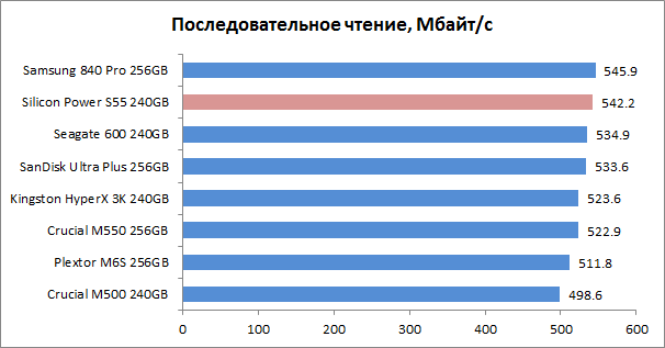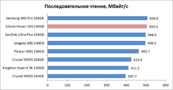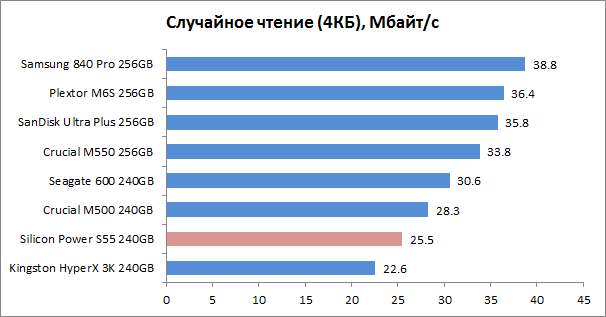 Занятно, что ни Silicon Power, ни сама Phison не сообщают никаких чисел, описывающих скорость случайного чтения, а ведь это — один из самых важных показателей быстродействия SSD. Скрывать эту характеристику имеет смысл лишь в одном случае — если она у рассматриваемого SSD очень плохая. Впрочем, чудес производительности от платформы Phison S8 мы и не ожидаем, ведь это — бюджетное решение.