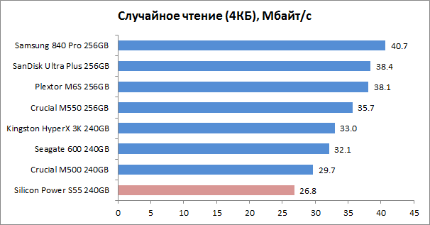 Кстати, совершенно неудивительно, что Phison и Silicon Power постеснялись указать для своих продуктов паспортную скорость случайных операций чтения. По нашим оценкам, она находится в районе очень скромных по сегодняшним меркам 68 тысяч IOPS.