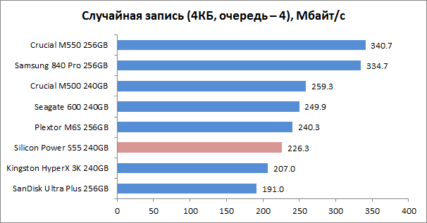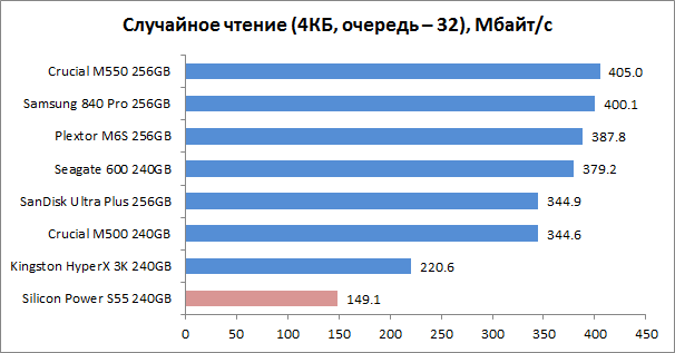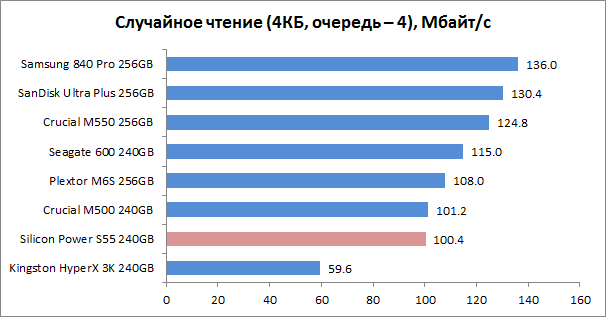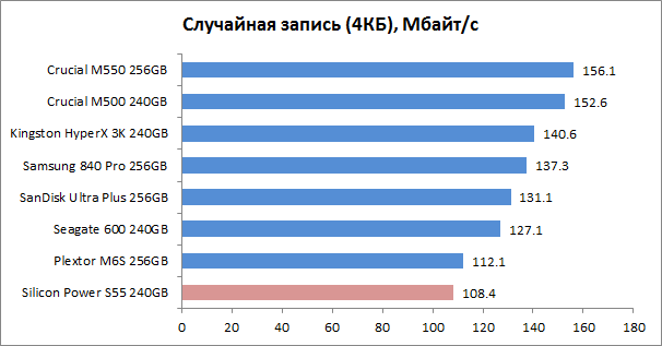 Последовательное чтение и запись — это те типы нагрузки, с которыми платформа Phison S8, вне всяких сомнений, справляется хорошо. При чтении её результат находится в лидирующей группе и упирается в пропускную способность интерфейса, а при записи Silicon Power Slim S55 выступает на уровне крепких середнячков Seagate 600 и Plextor M6S. Иными словами, акцент в паспортных характеристиках именно на скорости последовательных операций Phison делала не просто так — это сильные стороны её контроллера, который по данным параметрам вполне может метить даже в средний рыночный сегмент.