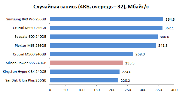 Оба графика наглядно показывают, что Silicon Power Slim S55 — накопитель, играющий в нижней лиге. Платформа Phison S8 может конкурировать с SandForce, но не более того. И если при записи со сравнительно небольшой глубиной очереди запросов, когда от контроллера не требуется особой вычислительной мощности и интеллектуальности, Silicon Power Slim S55 ещё может настичь младшие решения на контроллерах Marvell, то с увеличением нагрузки его относительная производительность скатывается вниз.