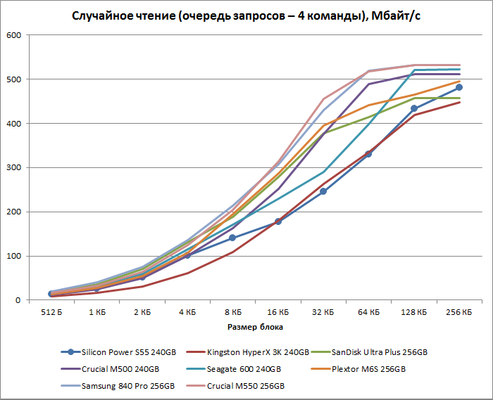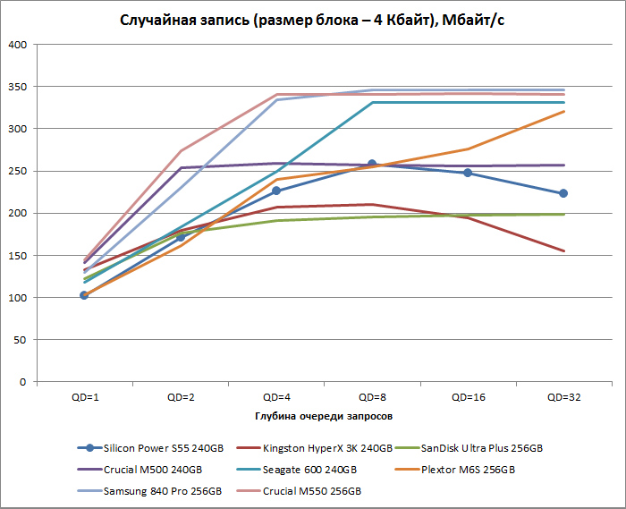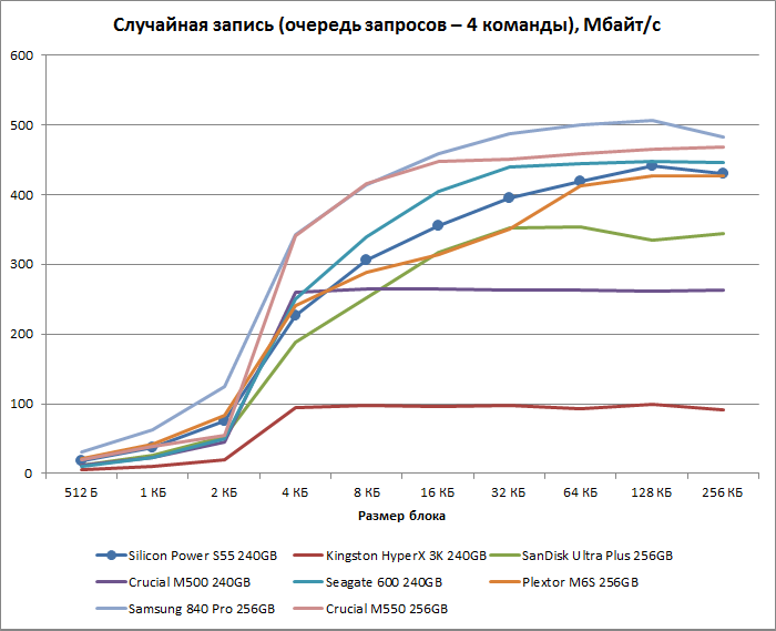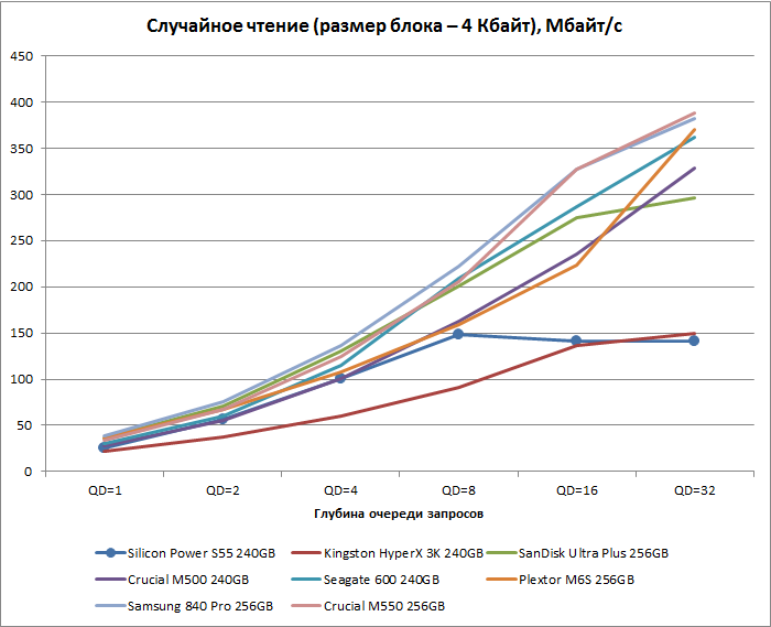 Давайте теперь взглянем на то, как зависит производительность Silicon Power Slim S55 ёмкостью 240 Гбайт при работе с 4-килобайтными блоками от глубины очереди запросов.