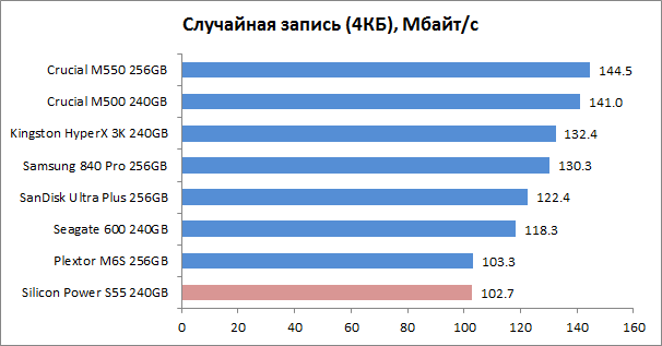 Со скоростью произвольной записи дело обстоит не намного лучше. Без очереди запросов результат Silicon Power Slim S55 – в арьергарде, но, когда операции формируют очередь, производительность немного подрастает и основанный на Phison S8 накопитель дотягивается по уровню производительности до платформы SandForce, которая, согласно наблюдаемым показателям практической производительности, является для платформы Phison основным конкурентом.