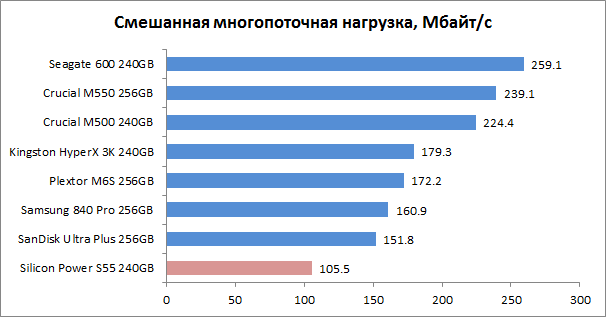 Ничего иного на самом деле и не ожидалось. Как показали предыдущие тесты, при случайных операциях платформа Phison S8 и накопитель Silicon Power Slim S55 работают крайне медленно — это явный признак низкой вычислительной мощности контроллера Phison PS3108-S8. То есть при сложной нагрузке, требующей от контроллера сколь-нибудь интеллектуальных действий, производительность будет проседать. Что мы и видим на графике выше — Silicon Power Slim S55 отстаёт от всех возможных конкурентов, причём уровень наблюдаемого отставания очень серьёзен.