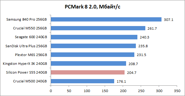 Производительность в PCMark 8 — один из важнейших параметров для понимания того, насколько хорош тот или иной накопитель в реальном использовании. И если верить полученным здесь показателям, получается, что накопитель Silicon Power Slim S55 — это бюджетный флеш-диск с начальным (по сегодняшним меркам) уровнем производительности. В этом SSD можно увидеть альтернативу SandForce-решениям, по средней скорости в приложениях они примерно одинаковы. Ни на что большее платформа, предлагаемая Phison, претендовать не может. Почти все недорогие SSD производителей первого эшелона оказались быстрее, чем Silicon Power Slim S55. Более того, заметно лучшую производительность смогли обеспечить даже Plextor M6S и SanDisk Ultra Plus — несмотря на то, что их контроллеры имеют вдвое более низкую степень параллелизма.