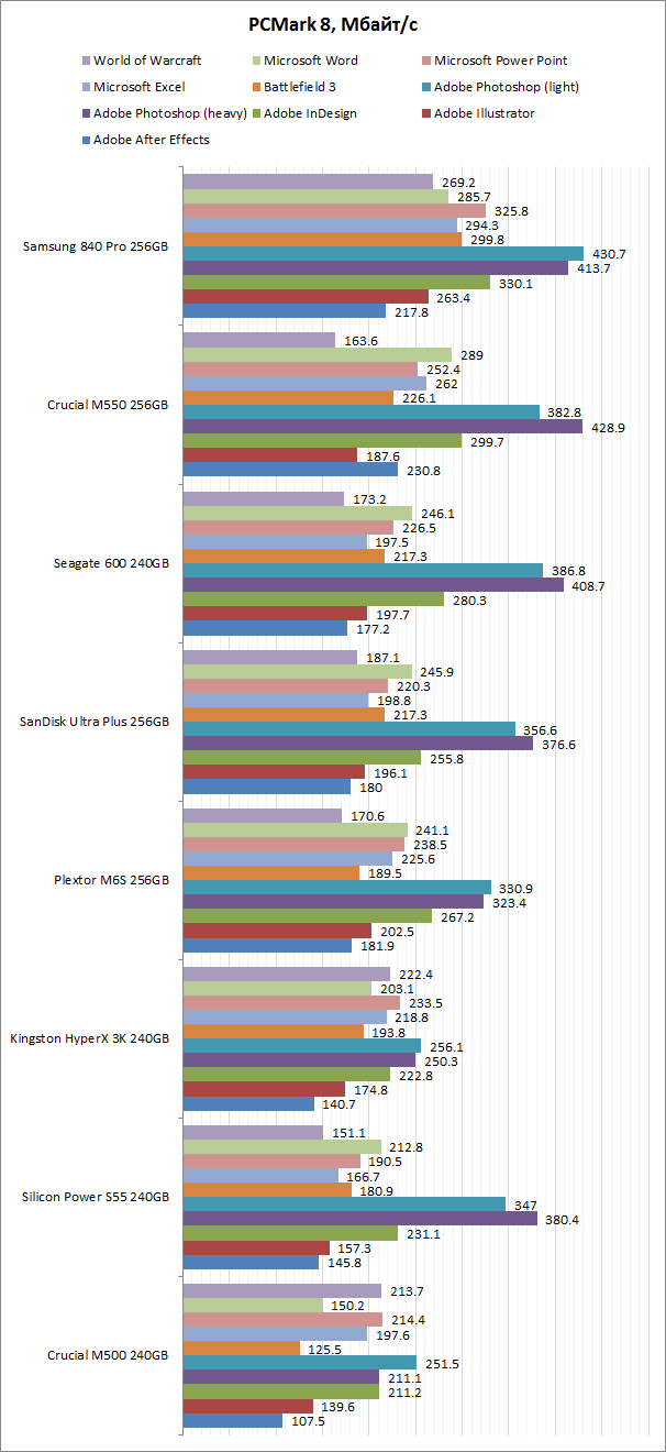 Тестовый пакет Futuremark PCMark 8 2.0 интересен тем, что он имеет не синтетическую природу, а напротив — основывается на том, как работают реальные приложения. В процессе его прохождения воспроизводятся настоящие сценарии-трассы задействования диска в распространённых десктопных задачах и замеряется скорость их выполнения. Текущая версия этого теста моделирует нагрузку, которая взята из реальных игровых приложений Battlefield 3 и World of Warcraft и программных пакетов компаний Abobe и Microsoft: After Effects, Illustrator, InDesign, Photoshop, Excel, PowerPoint и Word. Итоговый результат исчисляется в виде усреднённой скорости, которую показывают накопители при прохождении тестовых трасс.