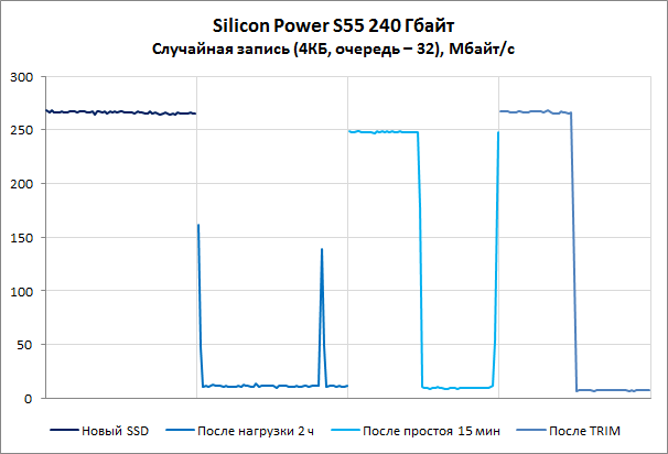 Самое же интересное, что TRIM у Silicon Power Slim S55 240 Гбайт работает примерно с тем же результатом, что и фоновая сборка мусора. Скорость накопителя возвращается к первоначальным величинам, однако после записи порядка 8 Гбайт данных падает обратно, до минимальных значений. Значит ли это, что Silicon Power Slim S55, а также и другие флеш-диски, построенные на платформе Phison S8, подвержены деградации производительности? Отнюдь нет. Как показало более подробное разбирательство, в конечном итоге TRIM отрабатывается рассматриваемым SSD вполне полноценно, и эта команда позволяет заранее освободить под будущие записи всё не занятое файлами пространство флеш-памяти. Однако обработка TRIM у Silicon Power Slim S55 происходит значительно медленнее, чем у всех прочих SSD. Например, выдерживаемой нами после подачи этой команды 15-минутной паузы для зачистки полного объёма SSD оказывается явно недостаточно.