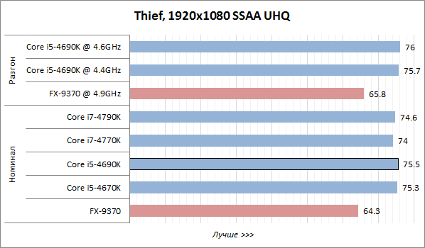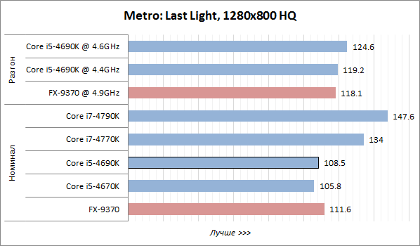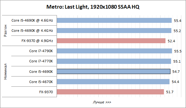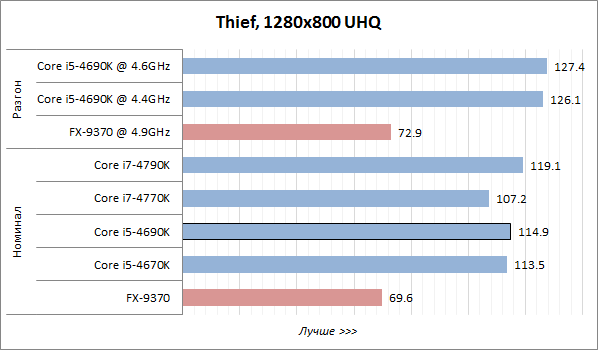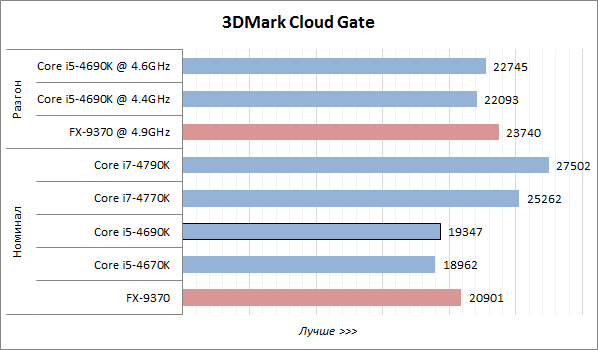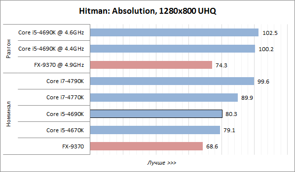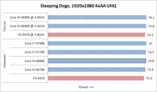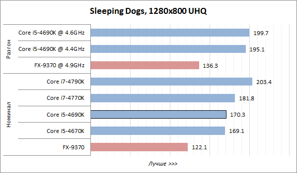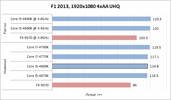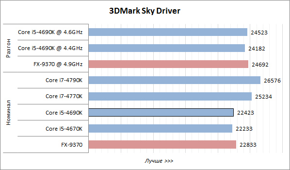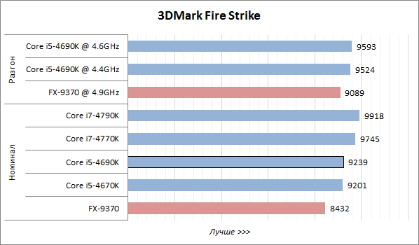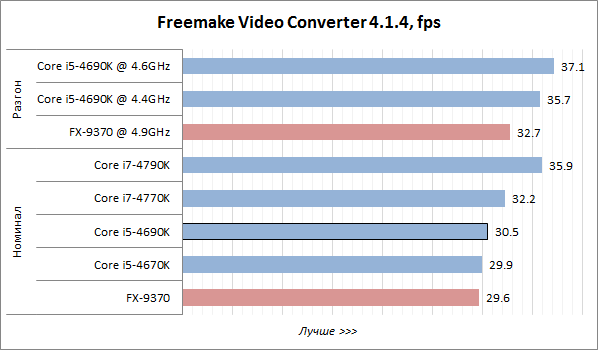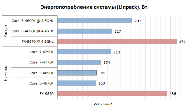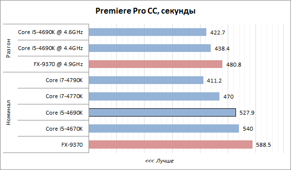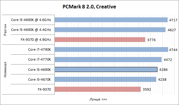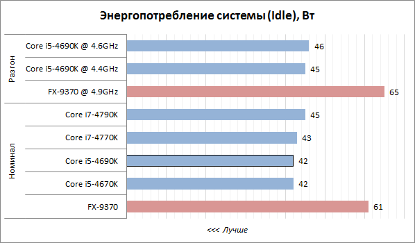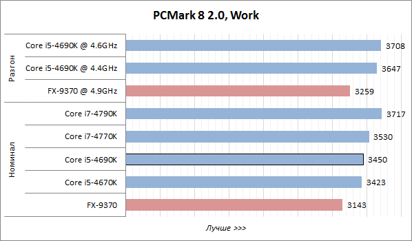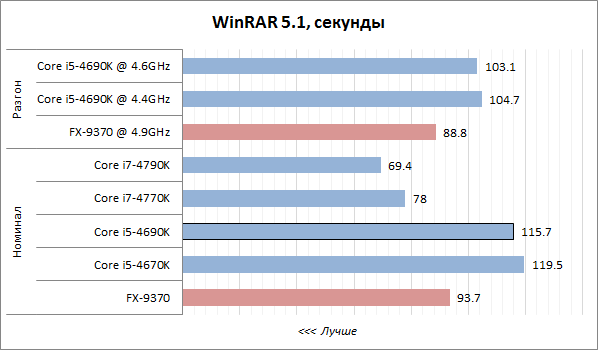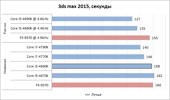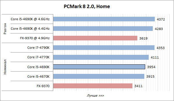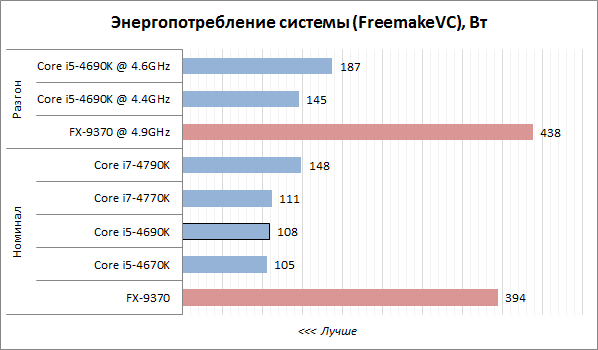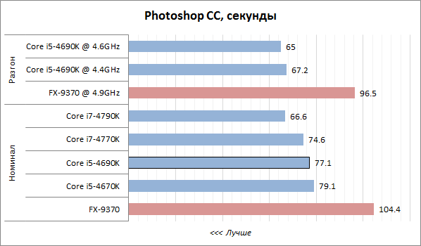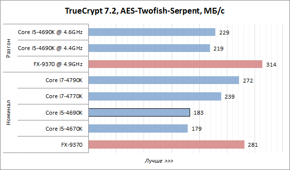 Процессоры Core i5-4690K и сходный с ним по стоимости FX-9370 тестировались дважды — не только при работе в номинальном режиме, но и при их стабильном и подходящем для долговременного использования разгоне, который достижим с применяемым нами воздушным охлаждением: