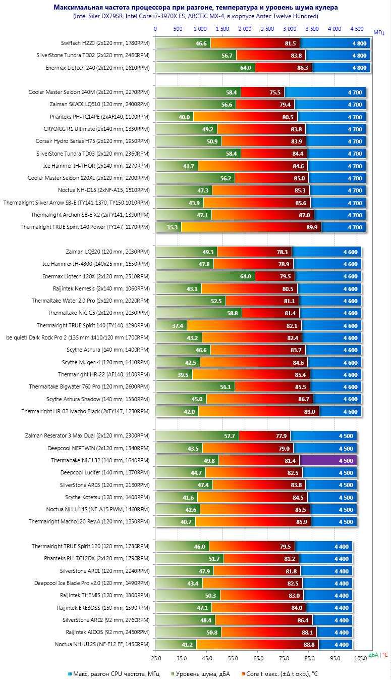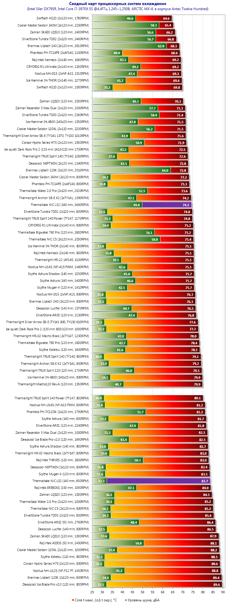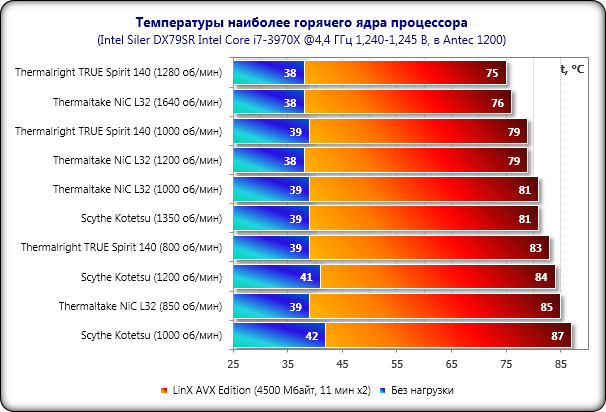 Полный снимок экрана во время проведения одного из циклов тестирования выглядит следующим образом. Нагрузка на процессор создавалась двумя последовательными циклами LinX AVX с указанными выше настройками. На стабилизацию температуры процессора между циклами отводилось 8–10 минут. За окончательный результат, который вы увидите на диаграмме, принята максимальная температура самого горячего из шести ядер центрального процессора в пике нагрузки и в режиме простоя. Кроме того, в отдельной таблице будут приведены температуры всех ядер процессора и их усреднённые значения. Комнатная температура контролировалась установленным рядом с системным блоком электронным термометром с точностью измерений 0,1 °C и возможностью почасового мониторинга изменения температуры в помещении за последние 6 часов. Как раз во время данного тестирования на улице установилась 30-градусная жара, поэтому в комнате температура окружения была довольно высокой и колебалась в диапазоне 26,3–26,7 °C. Измерение уровня шума систем охлаждения осуществлялось с помощью электронного шумомера CENTER-321 в период от одного до трёх часов ночи в полностью закрытой комнате площадью около 20 м2 со стеклопакетами. Уровень шума измерялся вне корпуса системного блока, когда источником шума в комнате являлся только сам кулер и его вентилятор. Шумомер, зафиксированный на штативе, всегда располагался строго в одной точке на расстоянии ровно 150 мм от статора вентилятора. Системы охлаждения размещались на самом углу стола на пенополиуретановой подложке. Нижняя граница измерений шумомера составляет 29,8 дБА, а субъективно комфортный (просьба не путать с низким!) уровень шума кулеров при измерениях с такого расстояния находится около отметки 36 дБА. Условно тихий уровень шума принят нами у границы 33 дБА. Скорость вращения вентиляторов изменялась во всём диапазоне их работы с помощью специального контроллера путём изменения питающего напряжения с шагом 0,5 В. По эффективности и уровню шума мы сравним Thermaltake NiC L32 с кулером Thermalright TRUE Spirit 140 (от 1 760 руб.), оснащённым одним штатным вентилятором TY-140. Поскольку стоимость Thermalright TRUE Spirit 140 немного выше, чем у новинки Thermaltake, мы решили включить в тестирование кулер подешевле, но также довольно удачный — Scythe Kotetsu (от 1 440 руб.). Добавим, что регулировка скорости вращения всех вентиляторов систем охлаждения осуществлялась с помощью специального контроллера с точностью ±10 об/мин в диапазоне от 800 или 1000 об/мин до их максимума с шагом 200 или 400 об/мин, в зависимости от скоростного режима работы конкретных вентиляторов. ⇡#Результаты тестирования и их анализЭффективность охлаждения Результаты тестирования эффективности трёх воздушных систем охлаждения представлены на диаграмме и в таблице. ![]() Одолеть Thermalright TRUE Spirit 140 новому Thermaltake NiC L32 не удалось, даже несмотря на более высокую скорость 140-мм вентилятора. Проигрыш Non-interference-кулера в данном режиме составляет один градус Цельсия в пике нагрузки. Если же сравнивать два этих кулера при одинаковой скорости вентиляторов, например — 1000 об/мин, то проигрыш Thermaltake NiC L32 увеличивается до 3 градусов Цельсия, а при 800~850 об/мин — 2 градусов Цельсия. В общем-то, не так уж и много. Зато Scythe Kotetsu новинка опережает во всех скоростных режимах работы штатных вентиляторов. Можно сказать, что Thermaltake NiC L32 как по стоимости, так и по эффе