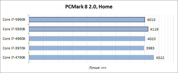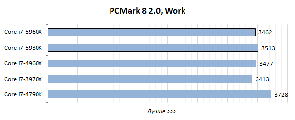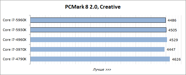 Хотя мы по традиции начали тестирование с популярного бенчмарка PCMark 8 2.0, в данном случае его показатели мало что значат для потенциальных покупателей систем, построенных на базе процессоров Haswell-E. Средневзвешенная производительность в общеупотребительных приложениях их интересует в последнюю очередь, такие конфигурации обычно собираются либо в качестве бескомпромиссных геймерских систем, либо для создания и обработки контента высокого разрешения.