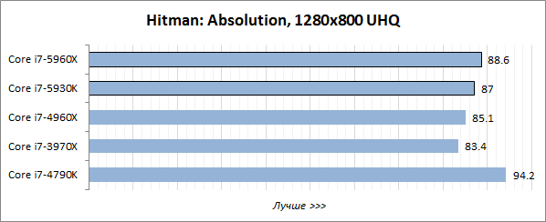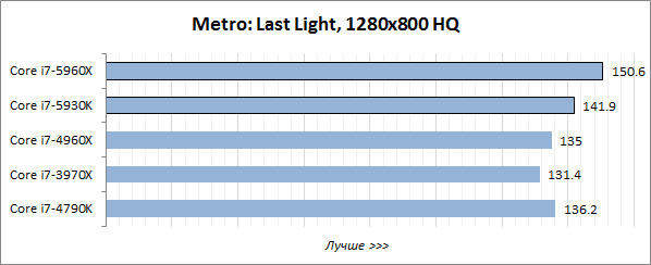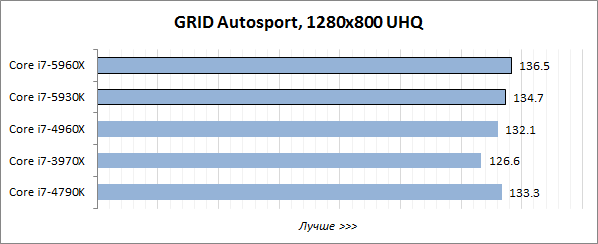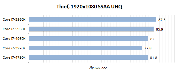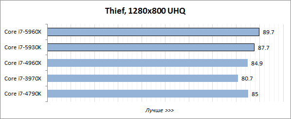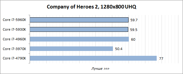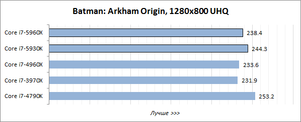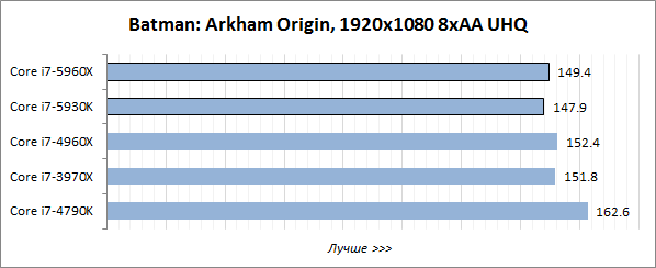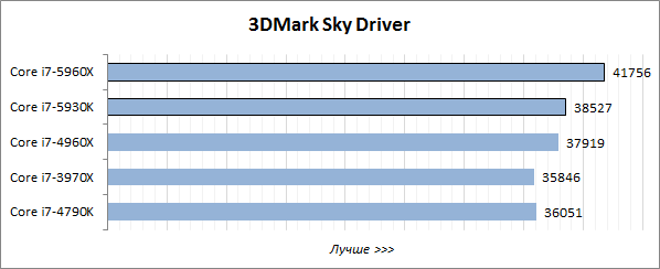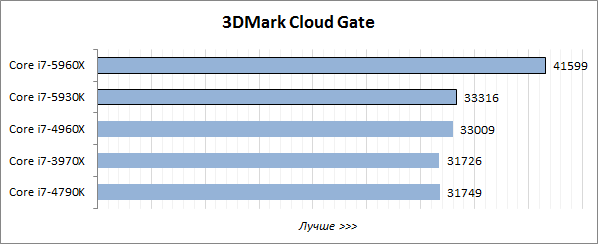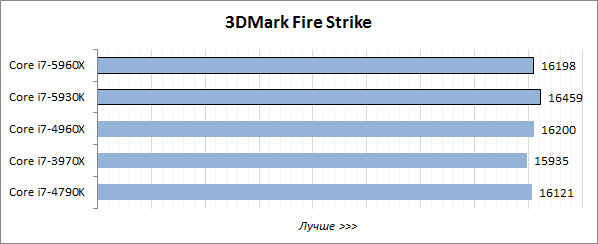 Игровой тест Futuremark 3DMark хорошо оптимизирован под многопоточность, поэтому в нём лидерство восьмиядерного Core i7-5960X Extreme Edition не вызывает никаких сомнений, а шестиядерный Core i7-5930K выступает на одном уровне с Core i7-4960X Extreme Edition и заметно опережает четырёхъядерник Core i7-4790K.
