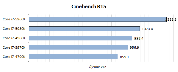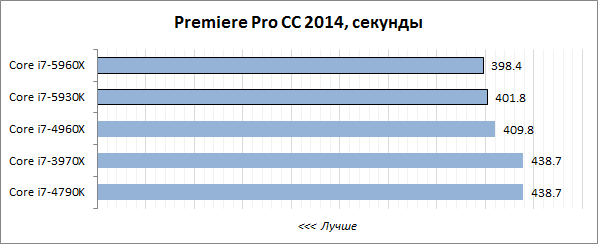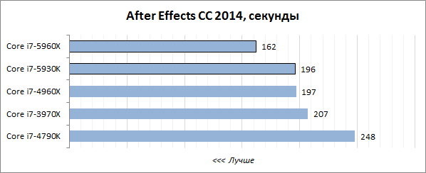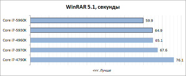 В то же время нельзя не отметить, что восьмиядерный Core i7-5960X выступает как минимум не хуже, чем его шестиядерный предшественник Core i7-4960Х. Несмотря на то, что тактовые частоты новинки существенно ниже, чем у старшего Ivy Bridge-E, она достойно справляется с разносторонней нагрузкой. В этом ей, по всей видимости, помогает лучшая микроархитектура с более высоким показателем IPC и вместительный 20-мегабайтный кэш третьего уровня, аналогов которому у других десктопных CPU попросту нет.