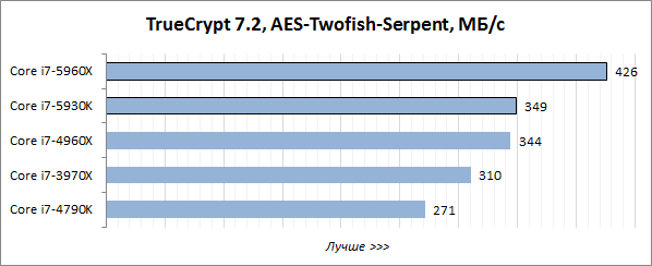 Полученный результат — весьма впечатляющее достижение. Как оказалось, восьмиядерный Haswell-E по своему разгону с воздушной системой охлаждения вплотную приближается к тем четырёхъядерным Haswell, которые Intel выпускает для процессорного разъёма LGA 1150. При этом номинальная частота Core i7-5960X составляет всего лишь 3,0 ГГц, то есть при разгоне мы смогли увеличить её более чем на 40 процентов. Если принять во внимание тот факт, что речь идёт о флагманском процессоре и о «мягком» оверклокинге без применения экстремальных методов охлаждения, то всё это кажется фантастикой. И если бы не 1000-долларовая цена, то Core i7-5960X мог бы с лёгкостью стать одним из самых востребованных CPU в среде энтузиастов разгона.