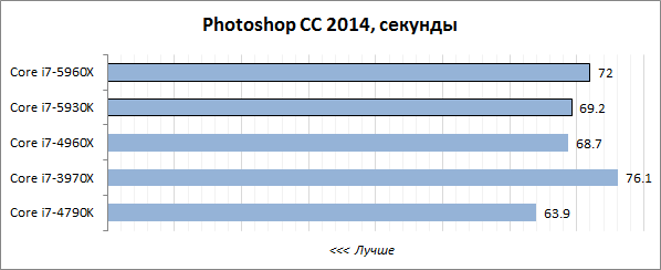 При этом шестиядерный Core i7-5930K по своей производительности сильно походит на Core i7-4960Х. Фактически, можно говорить, что он выступает для этого процессора прямым аналогом в платформе LGA 2011-v3. Выводя на рынок новую платформу для энтузиастов, Intel, похоже, очень хорошо оценила свои возможности, и LGA 2011-v3 действительно кажется следующей итерацией в развитии высокопроизводительных настольных систем. Впрочем, насколько верна эта оценка, будет понятно лучше на примере ресурсоёмких приложений. К тестам в них и перейдём.
