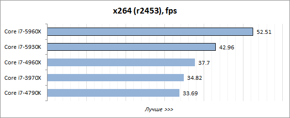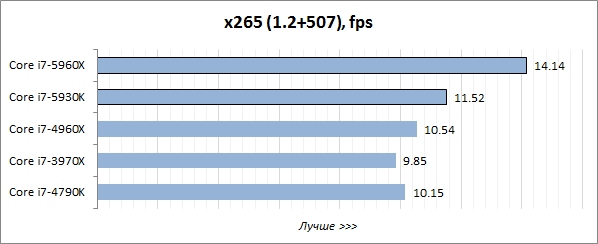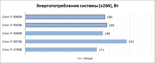 При решении распространённой многопоточной задачи по перекодированию видео кодером x264 процессоры Haswell-E с шестью и восемью ядрами демонстрируют примерно одинаковый уровень энергопотребления. Он немного выше, чем у Core i7-4960X, но заметно ниже, чем у старого процессора Sandy Bridge-E. При этом за счёт относительно невысоких тактовых частот потребление платформ на базе Core i7-5960X и Core i7-5930K не кажется чрезмерным даже на фоне потребления LGA 1150-системы с процессором Core i7-4790K. Но главным откровением в этом тесте для нас стало то, что восьмиядерник Core i7-5960X оказался даже немного экономичнее шестиядерной модели Core i7-5930K. Очевидно, здесь напрямую сказывается работа старшего Haswell-E при «энергоэффективном» напряжении Vcore.