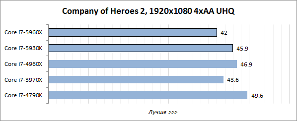 Если же усреднить показатели, представленные на графиках выше, то получится, что игровая производительность восьмиядерного Core i7-5960X Extreme Edition примерно соответствует уровню шестиядерных Core i7-5930K и Core i7-4960X. Однако LGA 1150 четырёхъядерник Core i7-4790K благодаря своей более высокой тактовой частоте всё же чуть быстрее всех этих процессоров-тяжеловесов, несмотря на то, что он располагает лишь четырьмя вычислительными ядрами. Впрочем, мы всё же не можем не отметить тот факт, что современные игры начинают потихоньку приходить к использованию многопоточных алгоритмов, поэтому Haswell-E и на геймерском поприще, кажется, имеют неплохие перспективы.