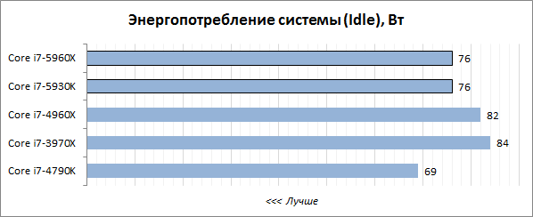 В состоянии простоя новые процессоры Haswell-E стали экономичнее своих предшественников, но до уровня обычных четырёхъядерных Haswell они не дотягивают. Виноваты более сложные внутрипроцессорные контроллеры памяти и шины PCI Express, более сложный набор системной логики, а также то, что в Haswell-E нет поддержки энергосберегающего состояния C7.