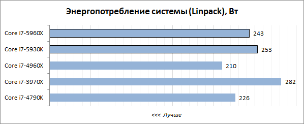 График энергопотребления в LinX повторяет предыдущий с той лишь разницей, что показатели в пакете Linpack выше, чем при перекодировании видео. Самой мощной в электрическом плане остаётся LGA 2011 система на базе Core i7-3970X — не даром этот процессор имеет официально установленное TDP 150 Вт. Платформа LGA 2011-v3 экономичнее, но незначительно. Вышедший же в прошлом году Core i7-4960X во многом благодаря отсутствию поддержки энергоёмких AVX2-инструкций требует меньше электроэнергии и чем Core i7-5960X, и чем Core i7-5930K, который, как неожиданно выясняется, является наименее энергоэффективным процессором в LGA 2011-v3 исполнении.