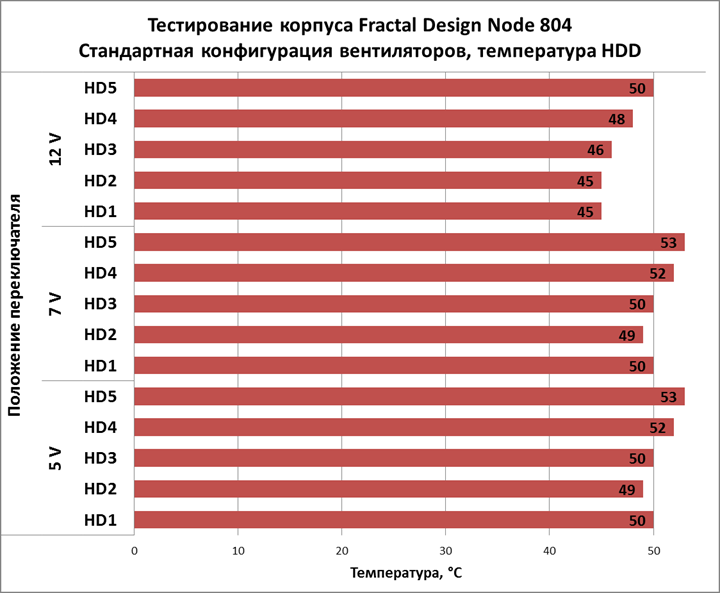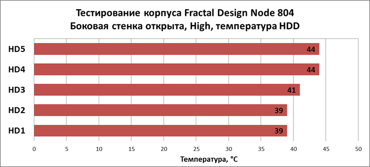 Температуры жестких дисков вынесены на отдельные графики. Порядок дисков совпадает с реальным положением в корпусе, однако требует пояснений: первый диск оказывается ближним к стенке, три последующих располагаются за ним, а пятый оказывается на дальней позиции второй корзины для накопителей. Соответственно, можно сделать вывод об эффективности охлаждения конкретного диска в конкретном месте. На этих графиках указана только максимальная температура, так как в перерывах между тестами работа HD Speed не приостанавливалась. Температуры простоя и нагрузки обозначены как максимум и минимум. Каждый тест включал в себя полчаса непрерывного нагрева и не менее двадцати минут на остывание компонентов.