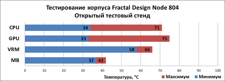 Минимальное значение температур не следует расценивать как абсолютно точное. Для процессора бралась температура самого горячего из ядер, что также дает разброс в несколько градусов.