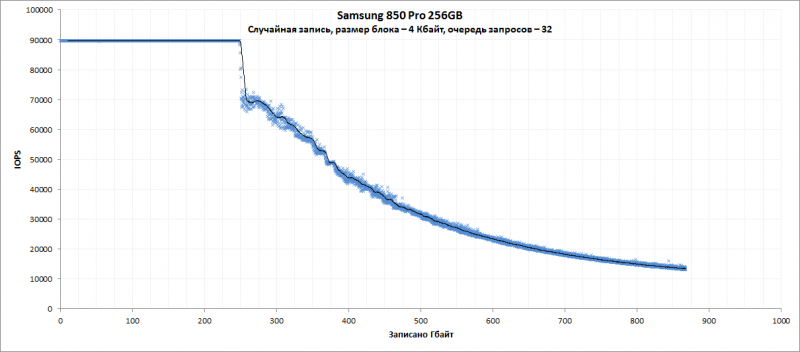 В результате эксперимента получился вот такой образцово-показательный график. До заполнения полной ёмкости Samsung 850 Pro демонстрирует постоянную и высокую скорость записи, затем производительность начинает снижаться. Однако степень падения производительности не слишком высока, первое время скорость уменьшается с 90 всего до 70 тысяч IOPS и лишь потом плавно приближается к асимптоте, лежащей в районе 13 тысяч IOPS. Это значит, что и в использованном состоянии Samsung 850 Pro работает лучше других потребительских SSD, скорость записи у которых просаживается заметно сильнее. Хорошей иллюстрацией этого выступает тот факт, что за время нашего 2-часового теста выносливости мы смогли записать на Samsung 850 Pro 256 Гбайт в общей сложности 867 Гбайт данных. При проведении же аналогичного испытания с другими флагманскими флеш-приводами такой же ёмкости объём записанной информации обычно составляет около 700-720 Гбайт.