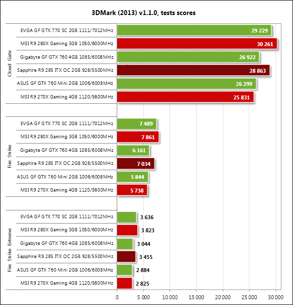 Для сравнения с Sapphire Radeon R9 285 ITX Compact OC Edition в качестве следующих за Radeon R9 285 по производительности видеокарт в тестирование включены EVGA GeForce GTX 770 Superclocked ACX 2 Гбайт и MSI Radeon R9 280X Gaming 3 Гбайт.