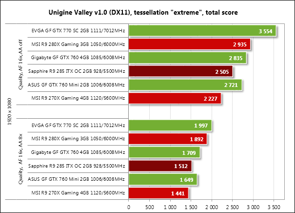 Куда скромнее достижения Sapphire Radeon R9 285 ITX Compact OC Edition и всех остальных видеокарт на графических процессорах AMD в тесте Unigine Valley.