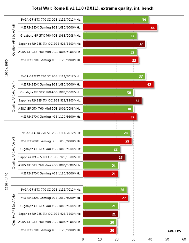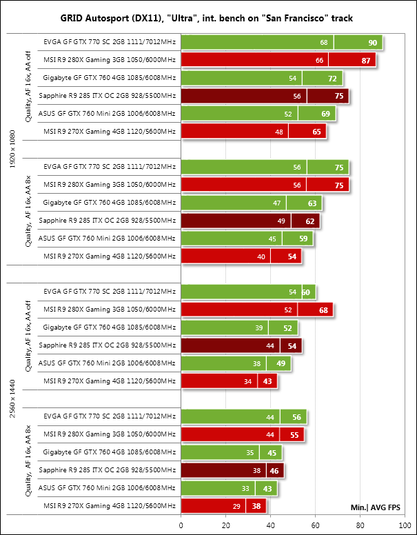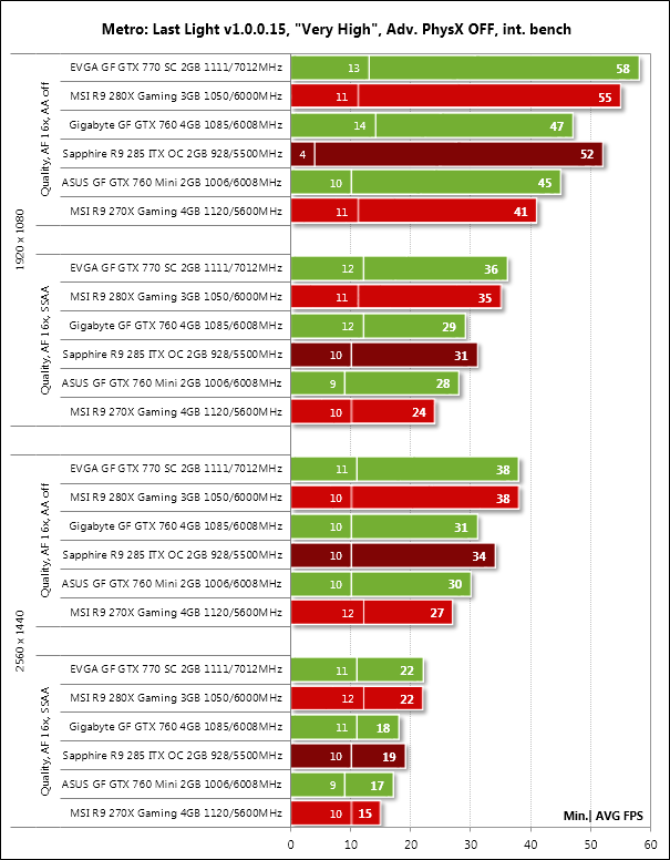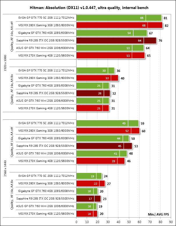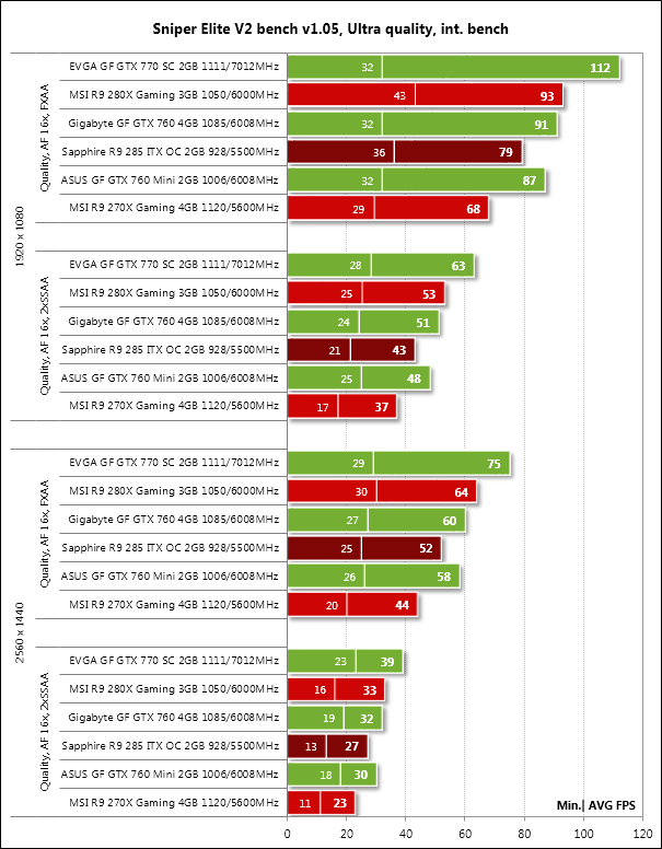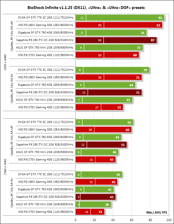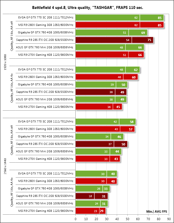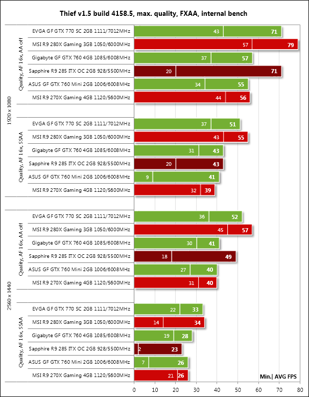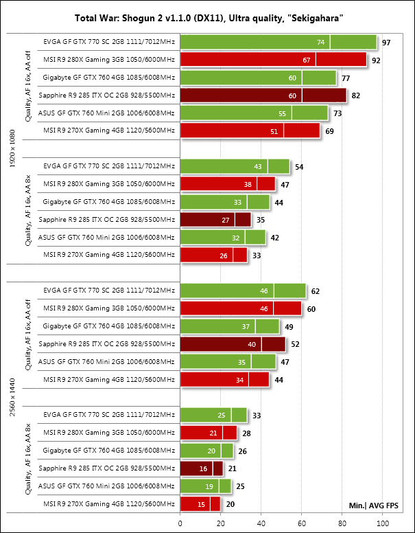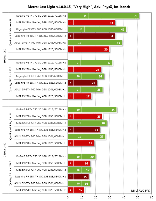 Однако на фоне общей победы AMD в этой игре ложкой дёгтя являются провалы производительности по минимальному FPS на Sapphire Radeon R9 285 ITX Compact OC Edition, в особенности в разрешении 2560х1440 с использованием сглаживания, когда даже от Radeon R9 270X можно наблюдать двукратное отставание. Причина банальна — нехватка видеопамяти вкупе с недостаточно эффективным алгоритмом сжатия текстур. Двух гигабайт здесь явно недостаточно, но та же ASUS GeForce GTX 760 DirectCU Mini способна демонстрировать более высокий FPS в этом режиме качества. Жаль, что Radeon R9 285 по умолчанию не наделили четырьмя гигабайтами видеопамяти.